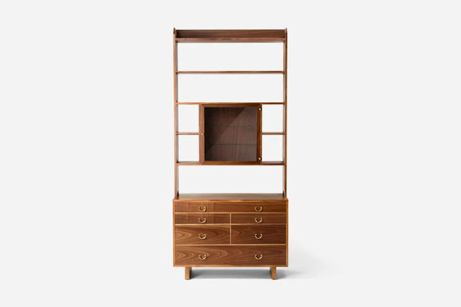 Bokhyllan är uppbyggd i två sektioner och går att kombinera på fyra olika sätt. Välj mellan två överdelar; en med enbart hyllor och en med hyllor och vitrin. Överdelarna kan användas tillsammans med två olika underdelar; en med låda och skåp och en byrå med sex lådor. Mahogny, glas och mässingsbeslag. Varje hylla är unik och träytan kan variera från utförandet på bilden. Samtliga Svenskt Tenns nyproducerade möbler är försedda med en plakett som visar att möbeln är äkta.