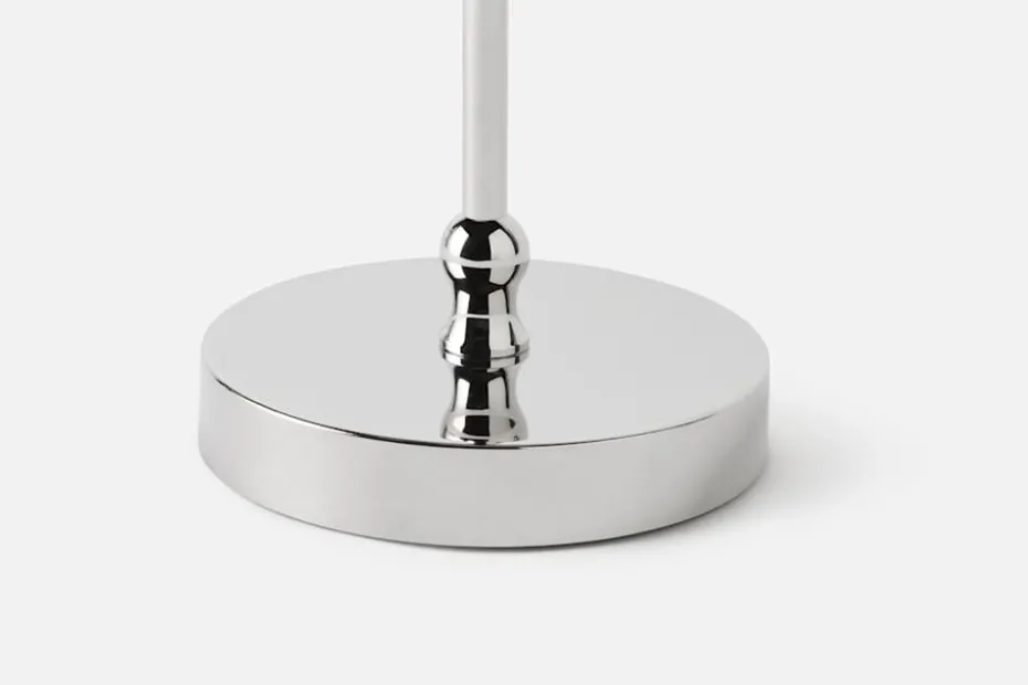 Svenskt Tenns lampor i förnicklad mässing torkas lätt med en fibertrasa eller putsar lätt med silverputs. Armaturen får inte komma i kontakt med vatten.