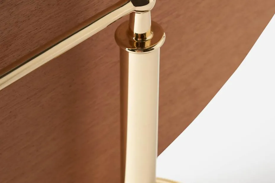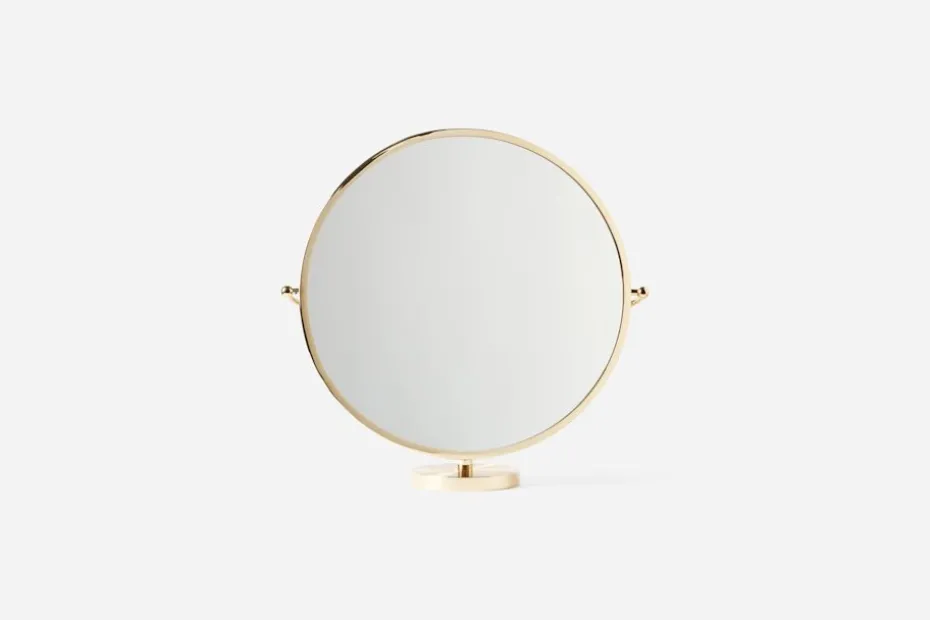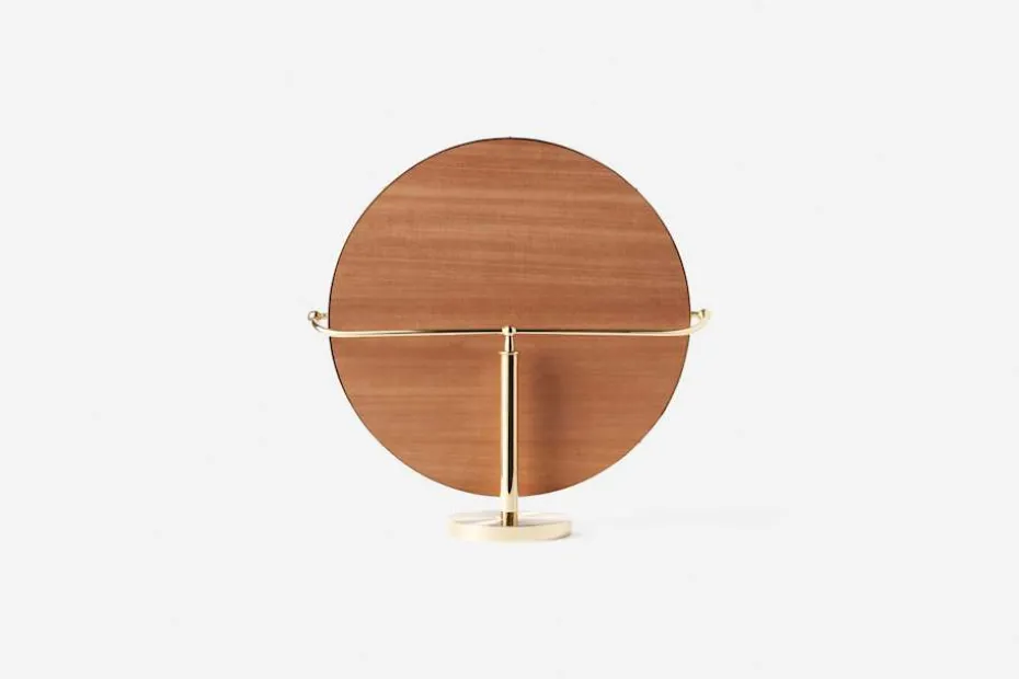En stor, rund bordsspegel i mässing som blir en vacker pjäs på byrån, i hallen eller sovrummet. Spegeln är formgiven av Josef Frank för Svenskt Tenn 1934. Den visades bland annat på Minnesutställningen på Nationalmuseum 1968. Spegeln står på fot och är både roterbar och vinkelbar.