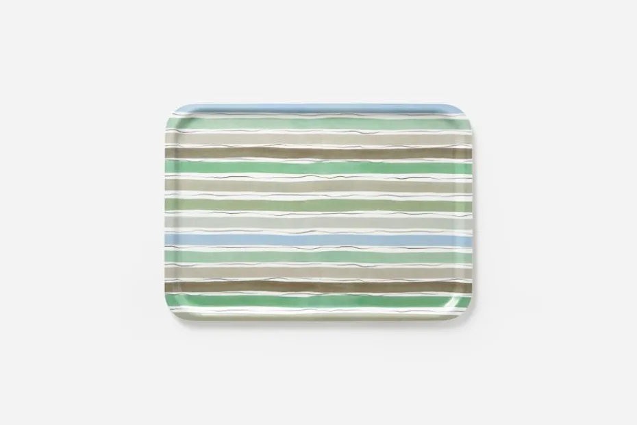 En fin frukostbricka till vår och sommar, med blågrönt mönster av Lars Nilsson för Svenskt Tenn. De målade ränderna är inspirerade av blommande blåregn i trädgården som omger Villa San Michele på Capri.