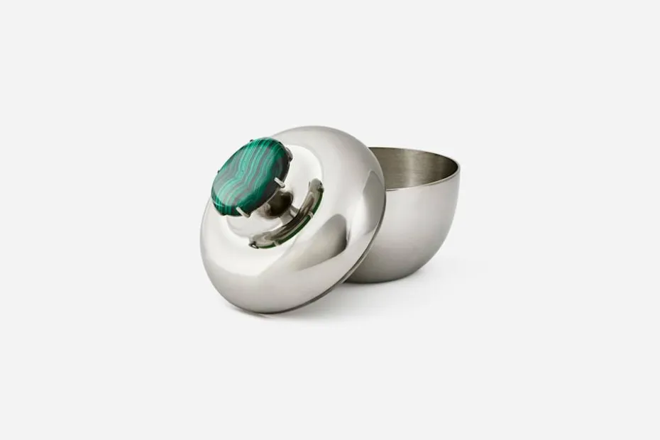 Josef Frank skapade burken i form av ett äpple under 1950-talets första hälft. Den formgavs ursprungligen i aluminium, men började tillverkas i tenn år 1951 på uppmaning av Estrid Ericson. Läs mer om Tennets färd till Strandvägen i Svenskt Tenns Magasin.