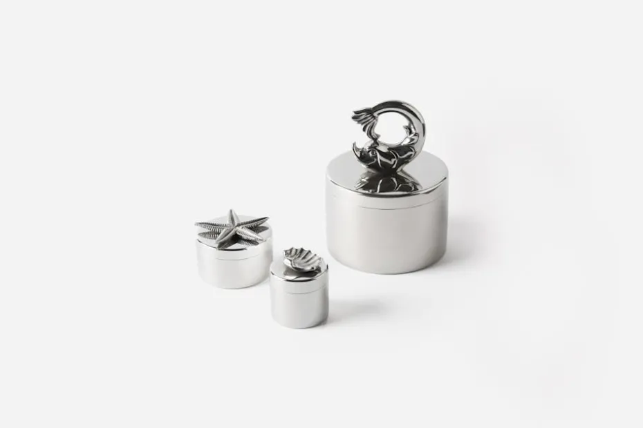 Estrid Ericson reste mycket och samlade under sina resor på sig olika slags saker och mönster. Att pryda ett föremål genom att addera ett annat objekt, var något som Estrid Ericson ofta gjorde. De små burkarna i tenn med figurer på locket är Svenskt Tenns egen design. Burkarna finns i tre olika storlekar och pryds med en delfin, en sjöstjärna eller en snäcka.