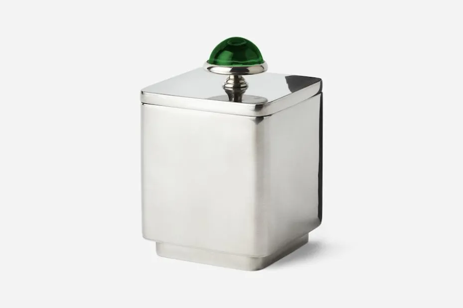 Denna tidlösa tennburk är prydd med en vacker grön glasknopp och formgavs ursprungligen som teburk. Svenskt Tenn har återskapat burken efter en förlaga ur arkivet. Där finns många tennföremål som smyckats med stenar eller andra objekt, ofta insamlade av Estrid Ericson under någon av hennes många resor runt om i världen.