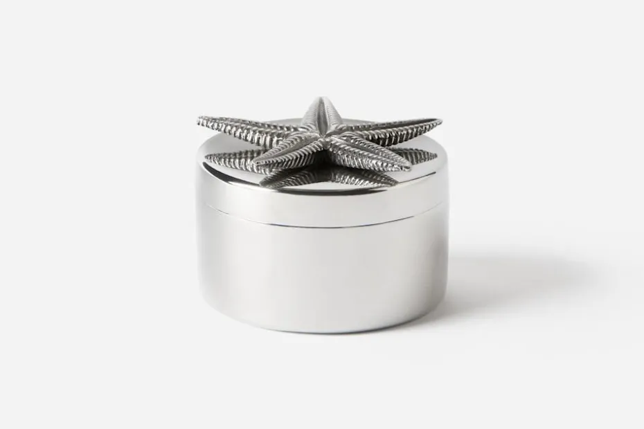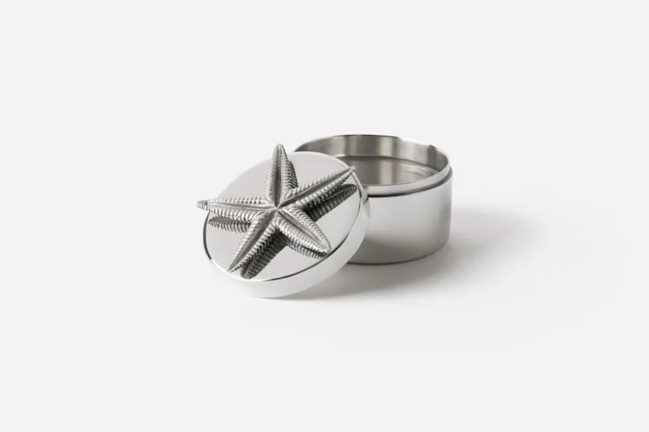Estrid Ericson reste mycket och samlade under sina resor på sig olika slags saker och mönster. Att pryda ett föremål genom att addera ett annat objekt, var något som Estrid Ericson ofta gjorde. De små burkarna i tenn med figurer på locket är Svenskt Tenns egen design. Burkarna finns i tre olika storlekar och pryds med en delfin, en sjöstjärna eller en snäcka.