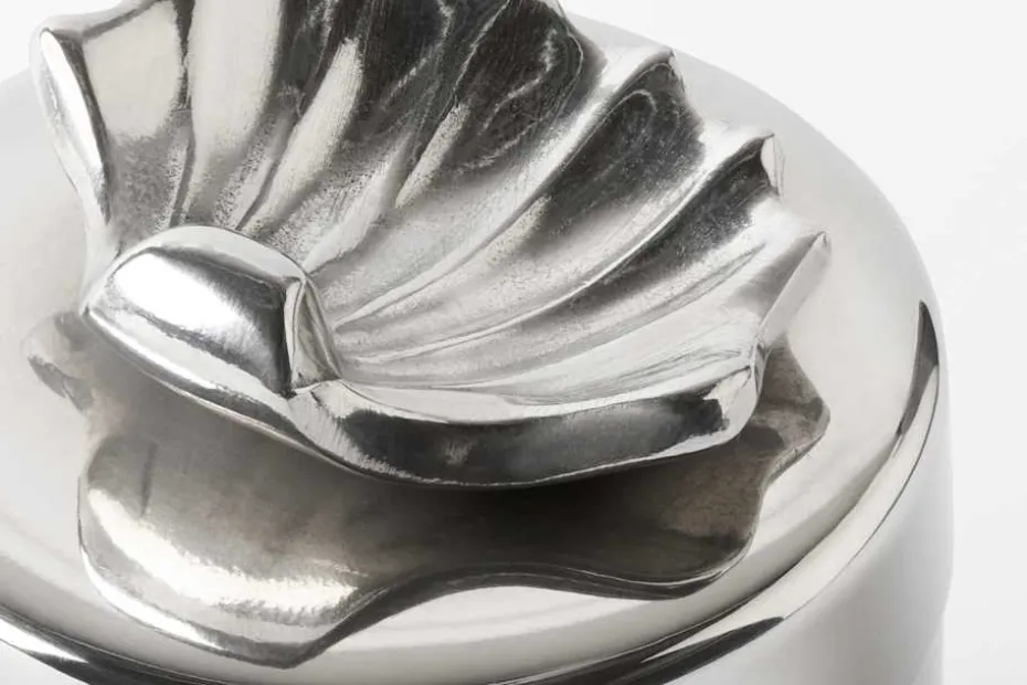 Estrid Ericson reste mycket och samlade under sina resor på sig olika slags saker och mönster. Att pryda ett föremål genom att addera ett annat objekt, var något som Estrid Ericson ofta gjorde. De små burkarna i tenn med figurer på locket är Svenskt Tenns egen design. Burkarna finns i tre olika storlekar och pryds med en delifn, en sjöstjärna eller en snäcka.
