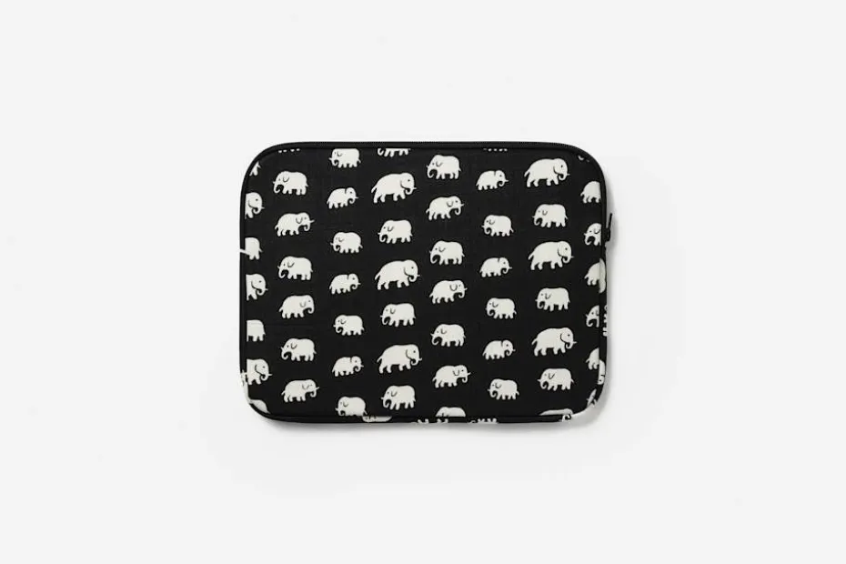 Handsytt, praktiskt och dekorativt datorfodral i Svenskt Tenns klassiska textil Elefant, formgivet av företagets grundare Estrid Ericson. Hon letade alltid efter vackra föremål, textilier och souvenirer att ta hem och sälja i butiken på Strandvägen. Det var efter en förlaga från Belgiska Kongo som hon formgav mönstret med de små elefanterna. Svenskt Tenn tryckte textil Elefant för första gången i slutet av 1930-talet. Elefantmönster