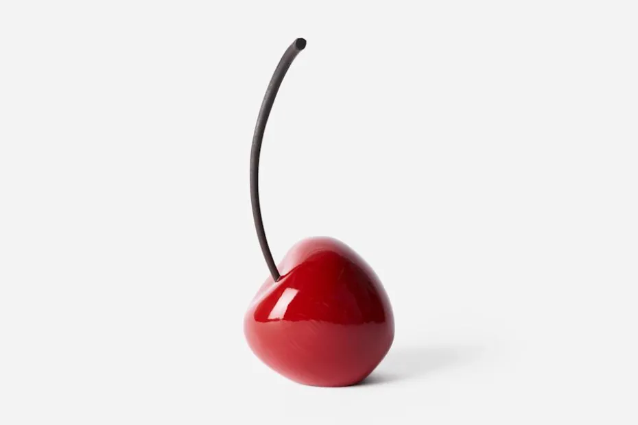 Ett stort, skulpturalt körsbär i trä formgivet av konstnären Pernilla Tjärnström. Det dekorativa körsbäret tillverkas för hand i furu, och varje exemplar laseras tunt för att släppa fram träets ådring och karaktär. Skaften tillverkas av återbrukade högafflar.