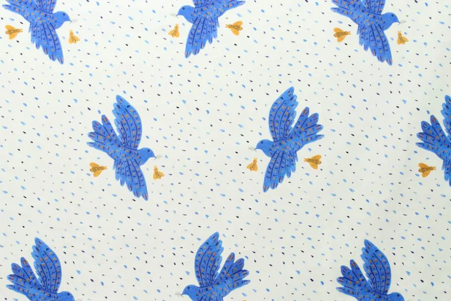 En vacker linneduk med motiv av blå fåglar, skapat av den grekiske konstnären Alekos Fassianos. I sina verk skapade Fassianos ofta rörelse i motivet genom att skildra vinden, vingar och flygande fåglar. I detta mönster syns två av hans återkommande motiv såsom fågeln och biet. Tillsammans visar de det poetiska formspråk som var så karaktäristiskt för Fassianos, och som för honom symboliserade frihet.