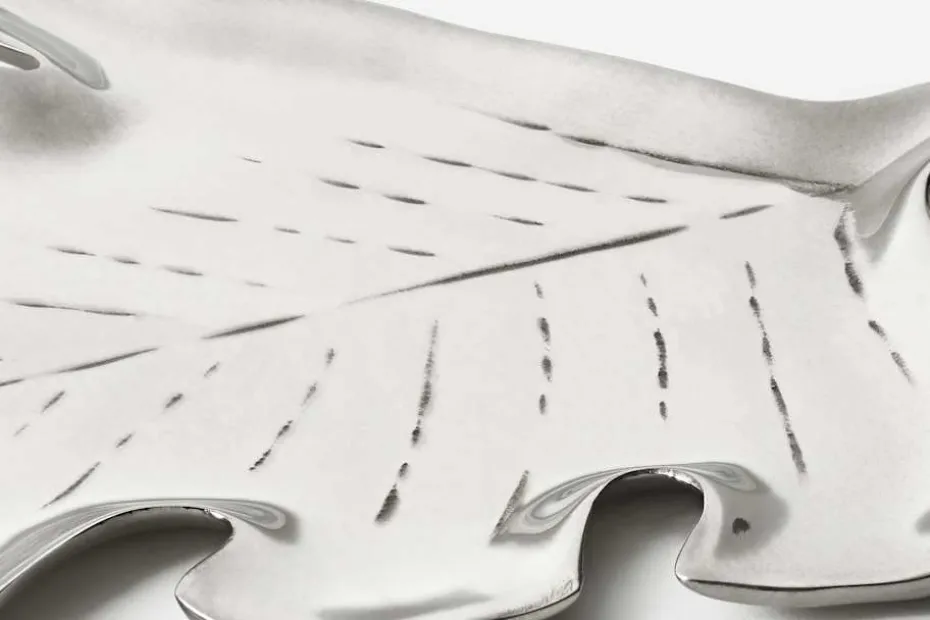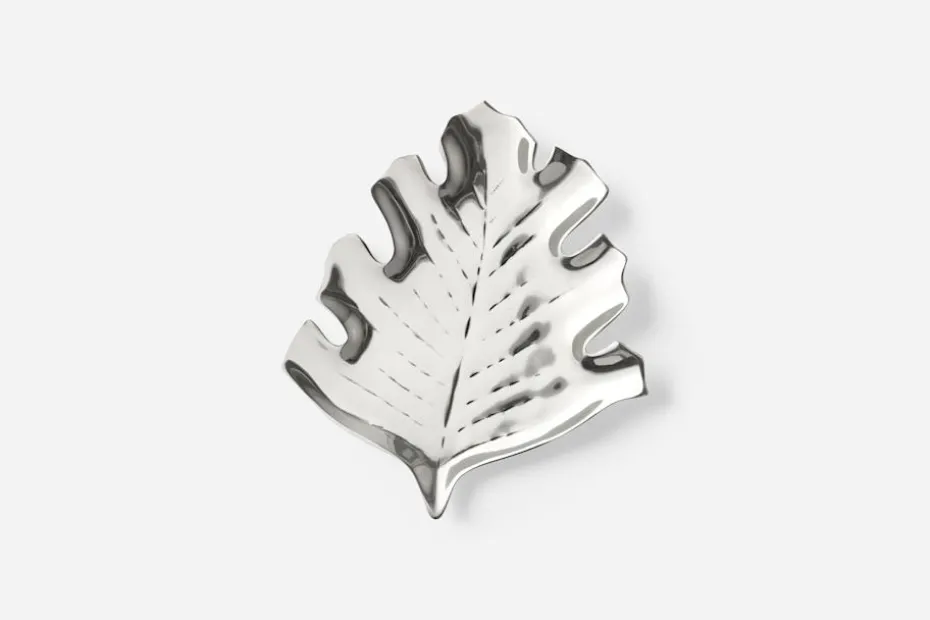 Detta löv är formgivet av Svenskt Tenn och var ursprungligen i mässing. Fatet gjordes senare även i tenn och glas.