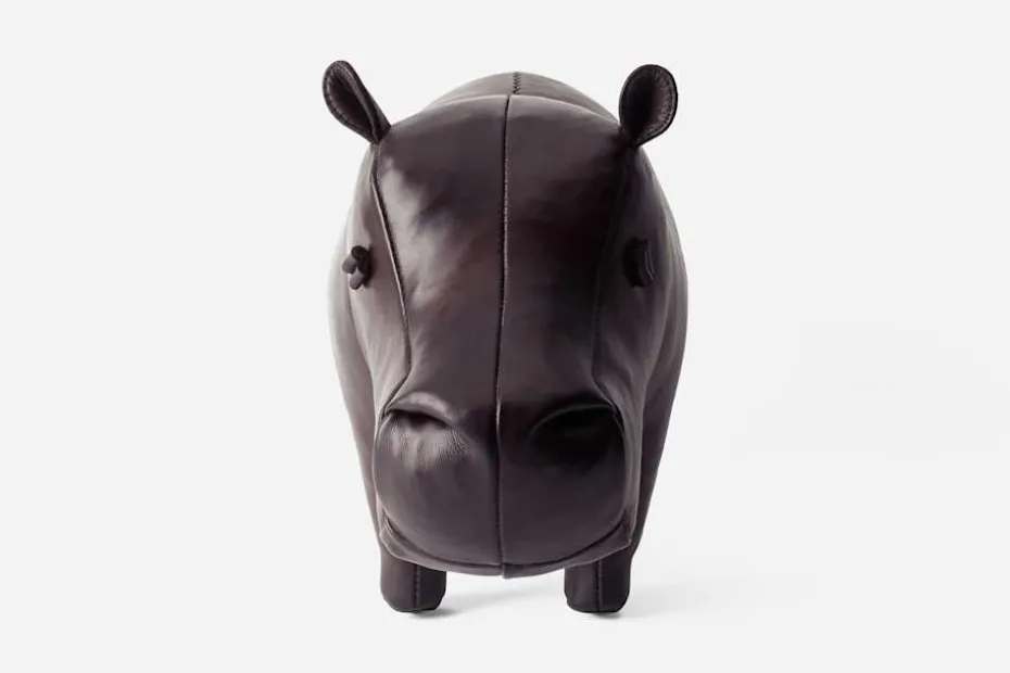Flodhästen i skinn kan användas som fotpall eller som inredningsdetalj i hemmet. Den har mjuka, runda former och ett leende som gör den till en underfundig och oemotståndlig detalj i interiören. Flodhästen är tillverkad av engelska Omersa, som grundades i London 1927. Det mjuka skinnet är färgat för hand till en djup, mahognybrun ton och har därefter vaxats och polerats för att skapa en elegant finish.