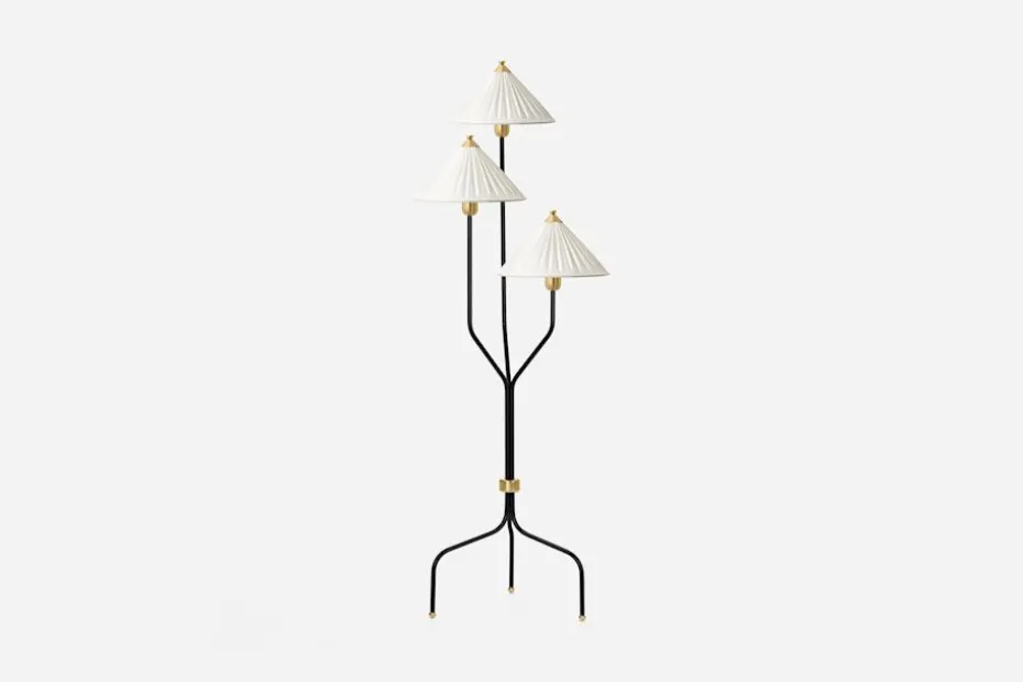 Denna golvlampa i svartlackerad mässing är formgiven av Josef Frank, vars lampor ofta var nätta och luftiga. Josef Frank formgav armaturerna så att glödlampshållaren blev synlig under skärmen.