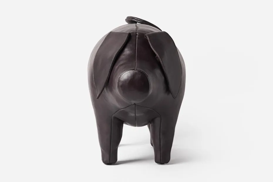 Grisen i skinn kan användas som fotpall eller som inredningsdetalj i hemmet. Den är tillverkad av engelska Omersa, som grundades i London 1927 – då den allra första grisen kom till. Det mjuka skinnet är färgat för hand till en djup, mahognybrun ton och har därefter vaxats och polerats för att skapa en elegant finish.