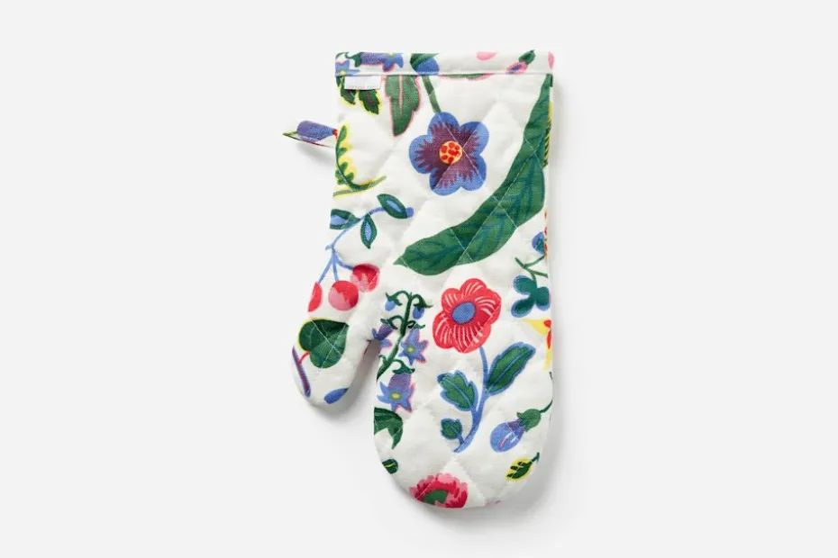 Svenskt Tenns grytvante smyckar köket med vackra mönster av Josef Frank och Estrid Ericson. Praktisk för varma grytor och ett fint inslag i köksinteriören. Denna klassiska grytvante pryds av mönstret Mille Fleurs. Ett tidigt komponerat mönster som Josef Frank döpte till Tulipan gjordes senare om för att passa den nya trycktekniken som började användas på 1940-talet. Mönstret var med denna förändring inte längre roterat, utan byggdes istället upp av rektanglar i upprepning. Det nya mönstret, som också fick en annan färgställning, döptes om till Mille Fleurs, den franska översättningen av Tusen Blommor.