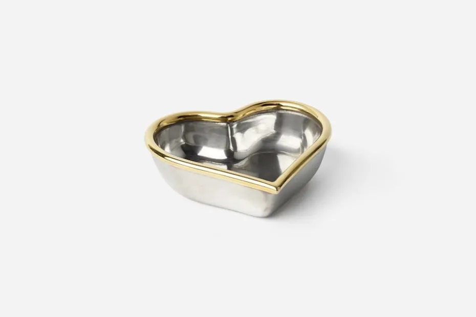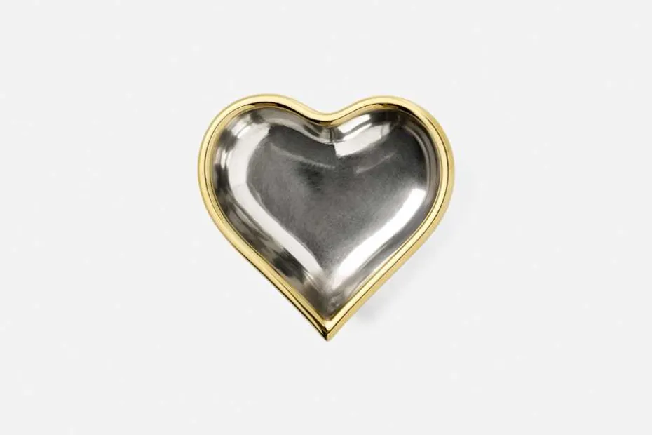 Estrid Ericson hade en förkärlek för hjärtan och vad de symboliserar och hon uppskattade tanken på att ge bort hjärtan till dem man tycker om. Den här tennburken med mässingskant är hennes egen formgivning.