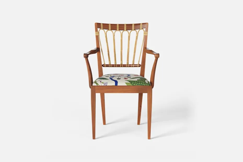 Efter sin återkomst till Stockholm från New York år 1946, formgav Josef Frank denna eleganta karmstol. Stolen har en genombruten rygg bestående av lindad rotting. För att skapa spänning i formen valde Josef Frank ofta att blanda olika träslag och material.