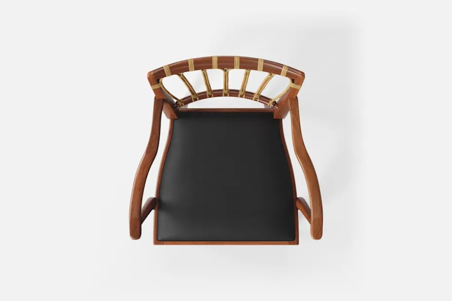 Efter sin återkomst till Stockholm från New York år 1946, formgav Josef Frank denna eleganta karmstol. Stolen har en genombruten rygg bestående av lindad rotting. För att skapa spänning i formen valde Josef Frank ofta att blanda olika träslag och material.