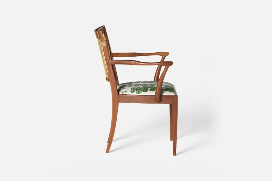 Efter sin återkomst till Stockholm från New York år 1946, formgav Josef Frank denna eleganta karmstol. Stolen har en genombruten rygg bestående av lindad rotting. För att skapa spänning i formen valde Josef Frank ofta att blanda olika träslag och material.