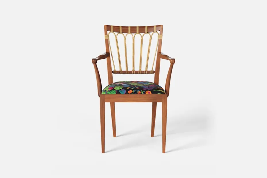 Efter sin återkomst till Stockholm från New York år 1946, formgav Josef Frank denna eleganta karmstol. Stolen har en genombruten rygg bestående av lindad rotting. För att skapa spänning i formen valde Josef Frank ofta att blanda olika träslag och material.