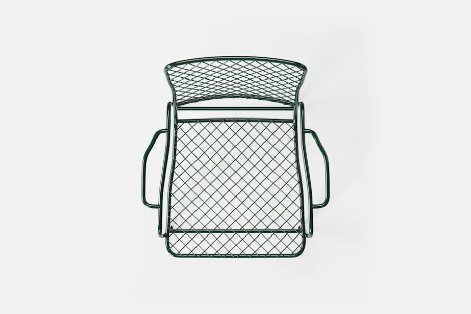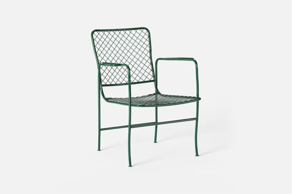 Trädgårdsmöbeln i lackerat järn med genombruten nätdekor i rygg och sits formgavs Josef Frank i mitten av 1930-talet. Den här typen av stålrörsmöbler var populära inom den funktionalistiska stilen som gjort sitt intåg i Sverige. I karmstol 591 har Josef Frank bytt ut det då ofta förekommande kromet mot den varma lackfärgen.