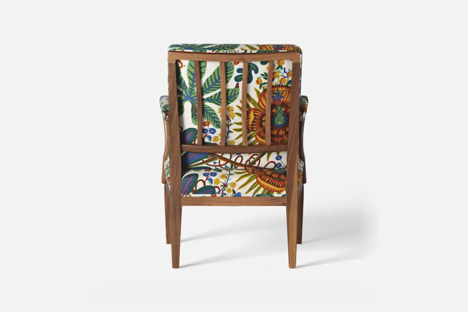I formgivningen av karmstol 868 inspirerades Josef Frank av 1700-talets nätta karmstolar med elegant svängda armstöd och raka ben. Han formgav stolen 1938.