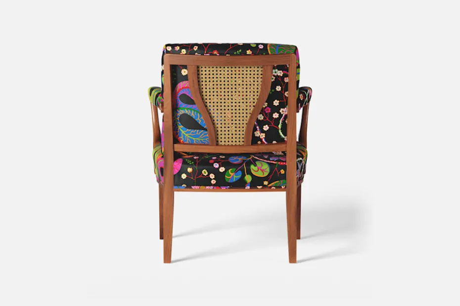 Med inspiration från 1700-talets nätta karmstolar formgav Josef Frank karmstol 969. För att skapa spänning i formgivningen valde Josef Frank ofta att blanda olika träslag och material. Karmstol 969 är gjord i mahogny med infällning av rotting i ryggen bakom den löstagbara kudden. Stolen formgavs 1939 och finns i två olika sitthöjder.