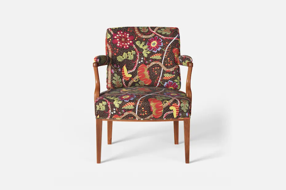 Med inspiration från 1700-talets nätta karmstolar formgav Josef Frank karmstol 969. För att skapa spänning i formgivningen valde Josef Frank ofta att blanda olika träslag och material. Karmstol 969 är gjord i mahogny med infällning av rotting i ryggen bakom den löstagbara kudden. Stolen formgavs 1939 och finns i två olika sitthöjder.