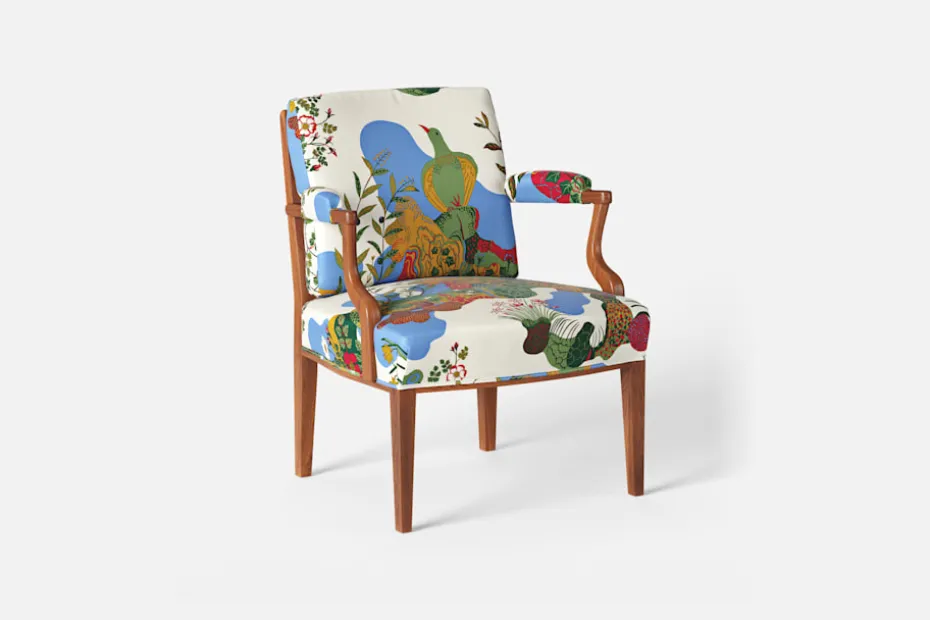 Med inspiration från 1700-talets nätta karmstolar formgav Josef Frank karmstol 969. För att skapa spänning i formgivningen valde Josef Frank ofta att blanda olika träslag och material. Karmstol 969 är gjord i mahogny med infällning av rotting i ryggen bakom den löstagbara kudden. Stolen formgavs 1939 och finns i två olika sitthöjder.