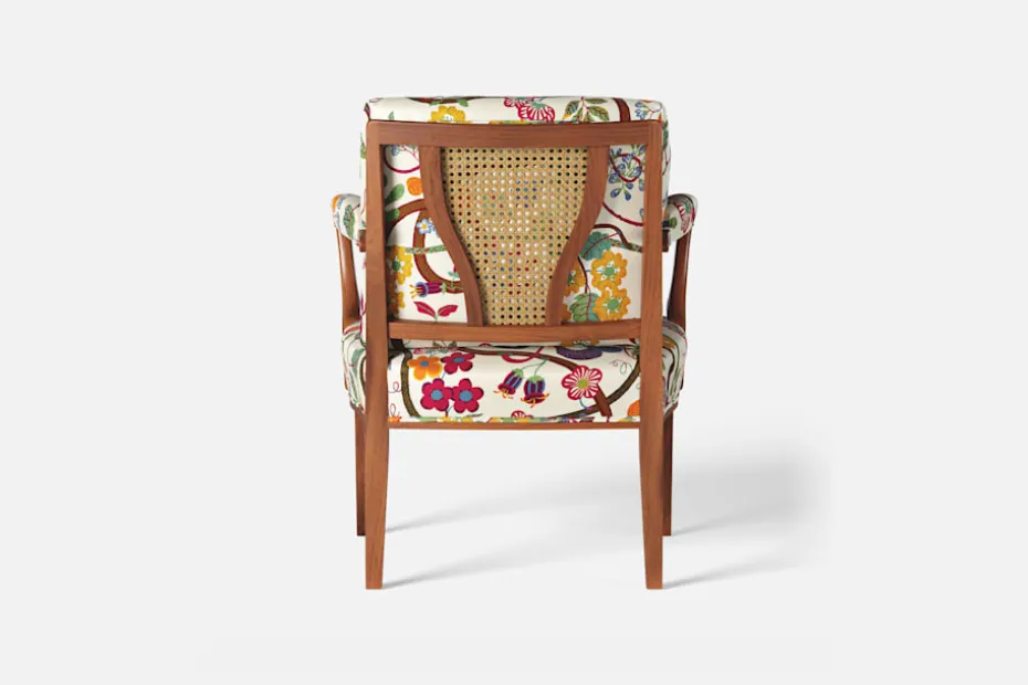 Med inspiration från 1700-talets nätta karmstolar formgav Josef Frank karmstol 969. För att skapa spänning i formgivningen valde Josef Frank ofta att blanda olika träslag och material. Karmstol 969 är gjord i mahogny med infällning av rotting i ryggen bakom den löstagbara kudden. Stolen formgavs 1939 och finns i två olika sitthöjder.