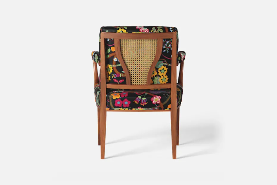 Med inspiration från 1700-talets nätta karmstolar formgav Josef Frank karmstol 969. För att skapa spänning i formgivningen valde Josef Frank ofta att blanda olika träslag och material. Karmstol 969 är gjord i mahogny med infällning av rotting i ryggen bakom den löstagbara kudden. Stolen formgavs 1939 och finns i två olika sitthöjder.