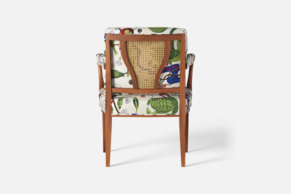 Med inspiration från 1700-talets nätta karmstolar formgav Josef Frank karmstol 969. För att skapa spänning i formgivningen valde Josef Frank ofta att blanda olika träslag och material. Karmstol 969 är gjord i mahogny med infällning av rotting i ryggen bakom den löstagbara kudden. Stolen formgavs 1939 och finns i två olika sitthöjder.