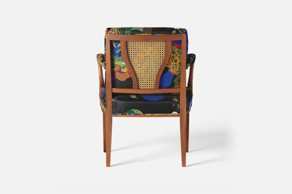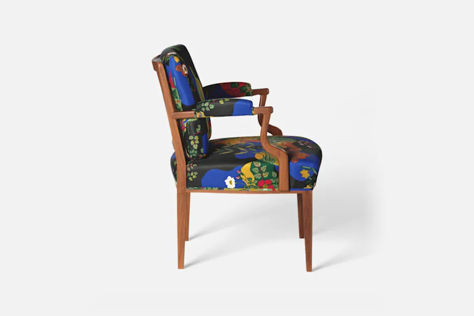 Med inspiration från 1700-talets nätta karmstolar formgav Josef Frank karmstol 969. För att skapa spänning i formgivningen valde Josef Frank ofta att blanda olika träslag och material. Karmstol 969 är gjord i mahogny med infällning av rotting i ryggen bakom den löstagbara kudden. Stolen formgavs 1939 och finns i två olika sitthöjder.