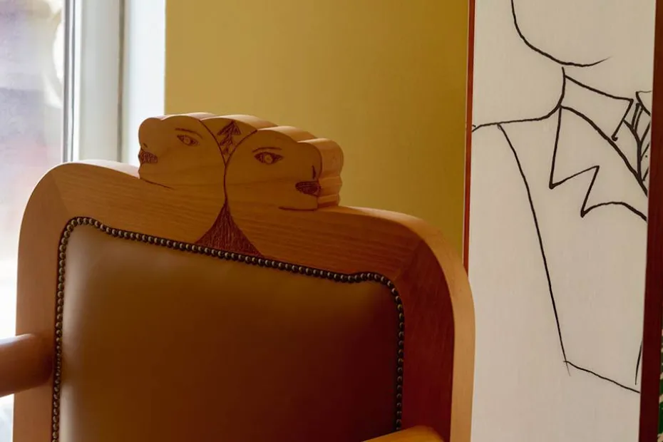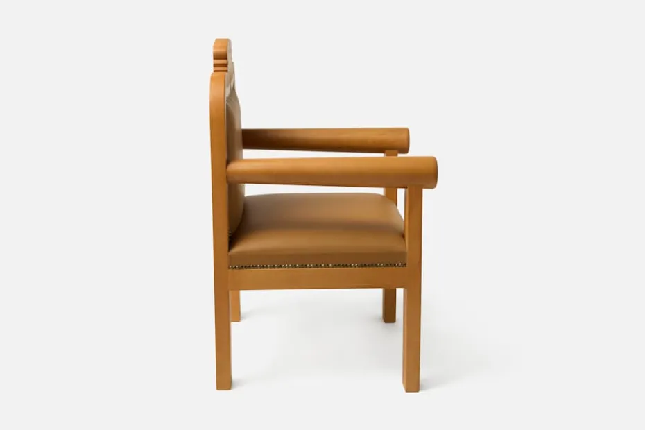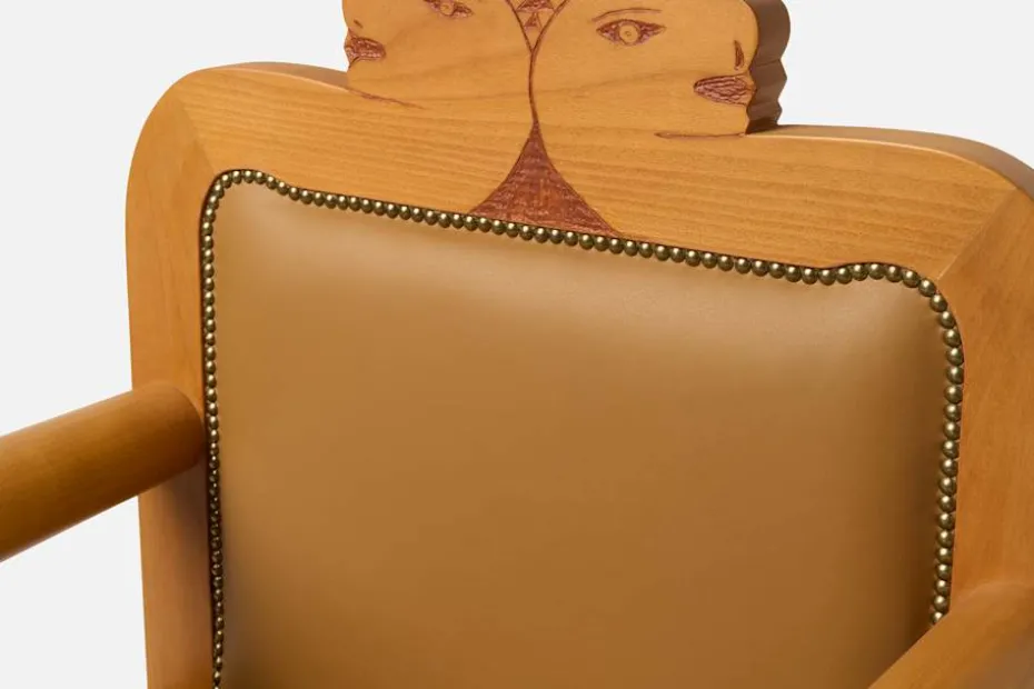 En vacker karmstol av Alekos Fassianos med konstnärens motiv avbildat i stolsryggen. Stolen är tillverkad i trä med lädersits. Den finns tillgängligt i ett exemplar och kan sedan beställas under en begränsad period på Svenskt Tenn.