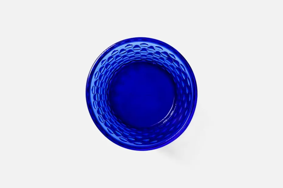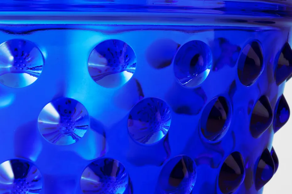 Krukan har en tunn skarv i glaset som uppkommer då den är pressad i en delbar gjutform. Den poleras i efterbearbetningen, men spår av den hantverksmässiga produktionen finns alltid kvar på slutprodukten.