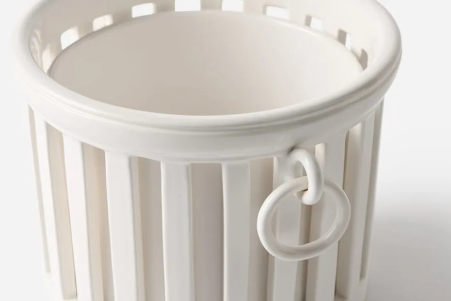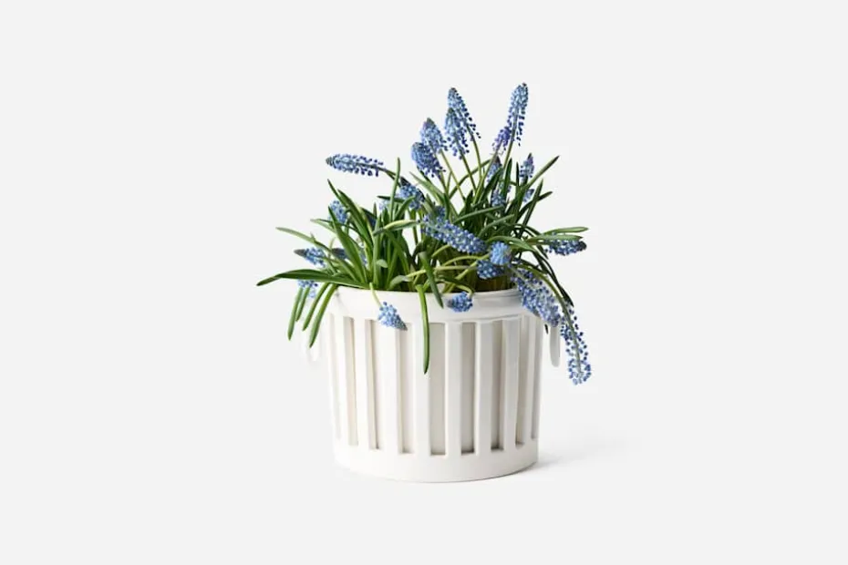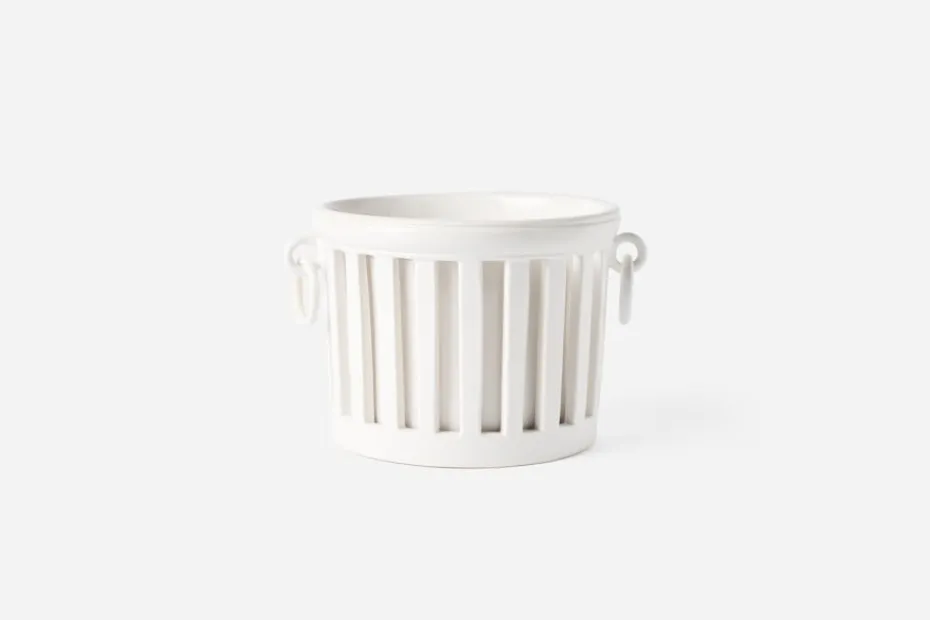En vacker, vit kruka i klassisk empirstil från franska Bourg Joly Malicorne. Krukan består av en lös, avtagbar innerkruka samt ett ytterfoder. Den tillverkas för hand i Malicorne sur Sarthe i Frankrike.