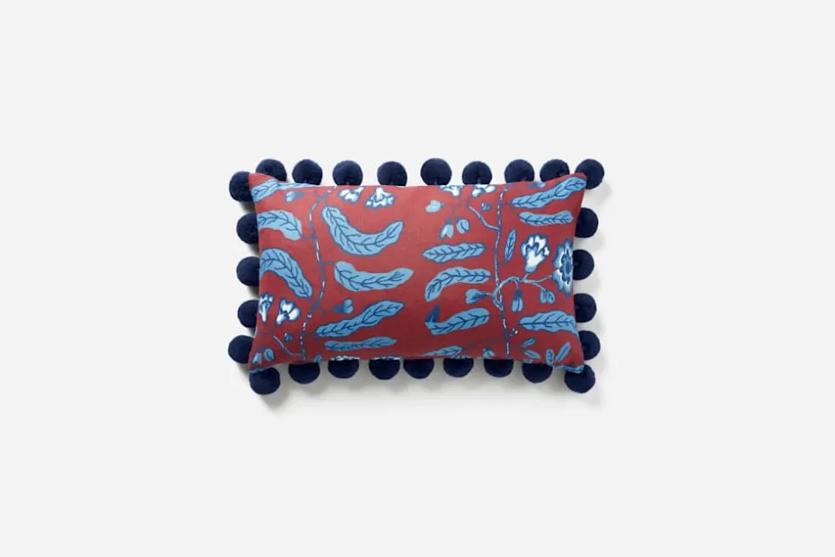 En tidlöst vacker linnekudde i Josef Franks mönster Chianti. Det rödblå motivet av ett dekorativt blad- och grenverk är något mer avskalat än det som ofta förknippas med Josef Frank. Chianti hör till Josef Frank tidiga textila mönster, formgivet för hans eget företag Haus & Garten i Wien, 1925-30.