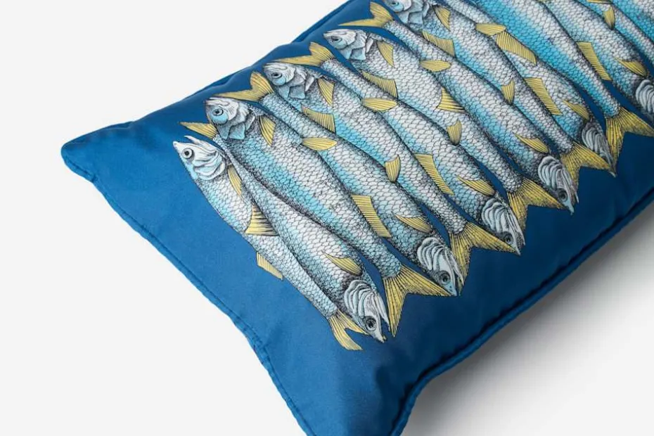 En vacker silkeskudde med sardinmotiv av Fornasetti, tillverkad för hand i Italien. I företagets ateljé arbetar skickliga hantverkare med samma tekniker som användes när de allra första produkterna togs fram.