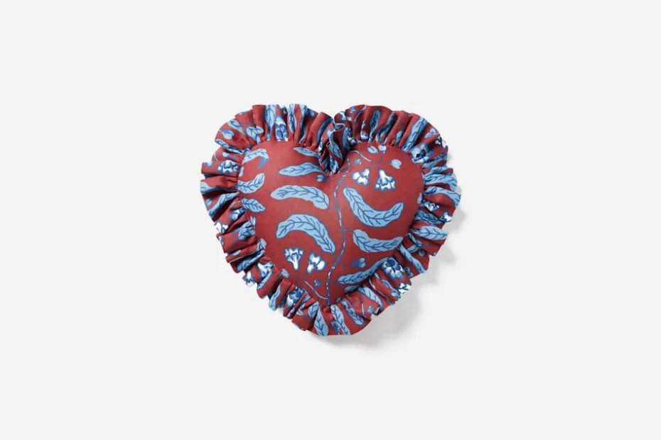 De lekfullt hjärtformade linnekuddarna i mönster av Josef Frank sys för hand efter en idé och vision av formgivaren Margherita Maccapani Missoni. Denna variant är uppsydd i det klassiska mönstret Chianti i rött och blått. Motivet av ett dekorativt blad- och grenverk är något mer avskalat än det som ofta förknippas med Josef Frank. Chianti hör till Josef Frank tidiga textila mönster, formgivet för hans eget företag Haus & Garten i Wien, 1925-30.