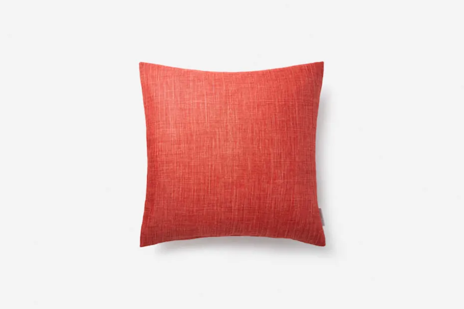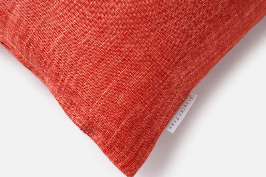 Kudde i Svenskt Tenns eget, enfärgade linnetyg i korall. Kudden kan kombineras såväl med enfärgade som mönstrade kuddar och textilier.