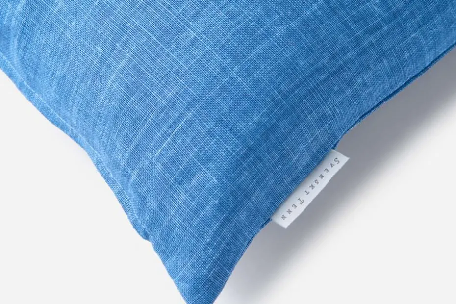 Kudde i Svenskt Tenns eget, enfärgade linnetyg i påfågelblå. Kudden kan kombineras såväl med enfärgade som mönstrade kuddar och textilier.