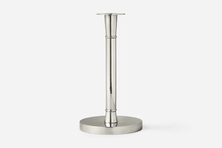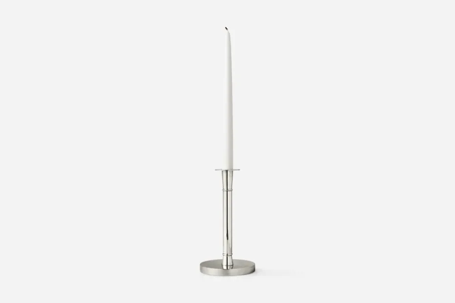 Denna klassiska tennljusstake formgavs 1929 för Svenskt Tenn. Den eleganta formen finns avbildad i företagets tennkatalog från 1931.