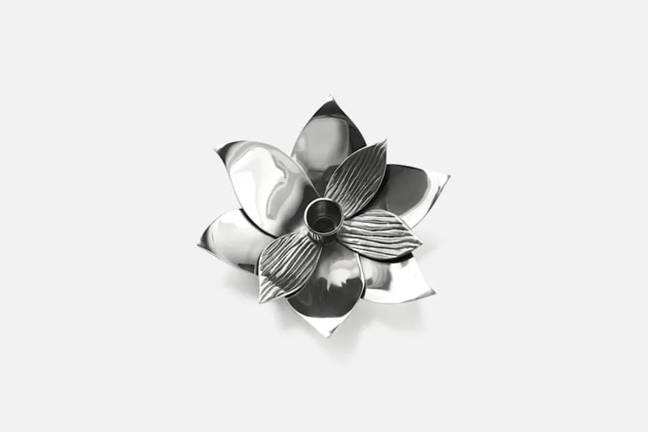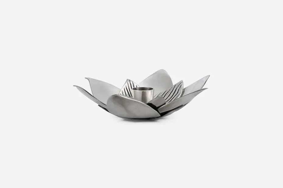 Ljusstaken som liknar en fullt utslagen lotus formgav arkitekt Björn Trägårdh 1929. Från början var ljusstaken en specialbeställning från en Mrs Isabelle Clow i Chicago, innan den skickades över till USA ställdes den ut på Nationalmuseum. Läs mer om Tennets färd till Strandvägen i Svenskt Tenns Magasin.
