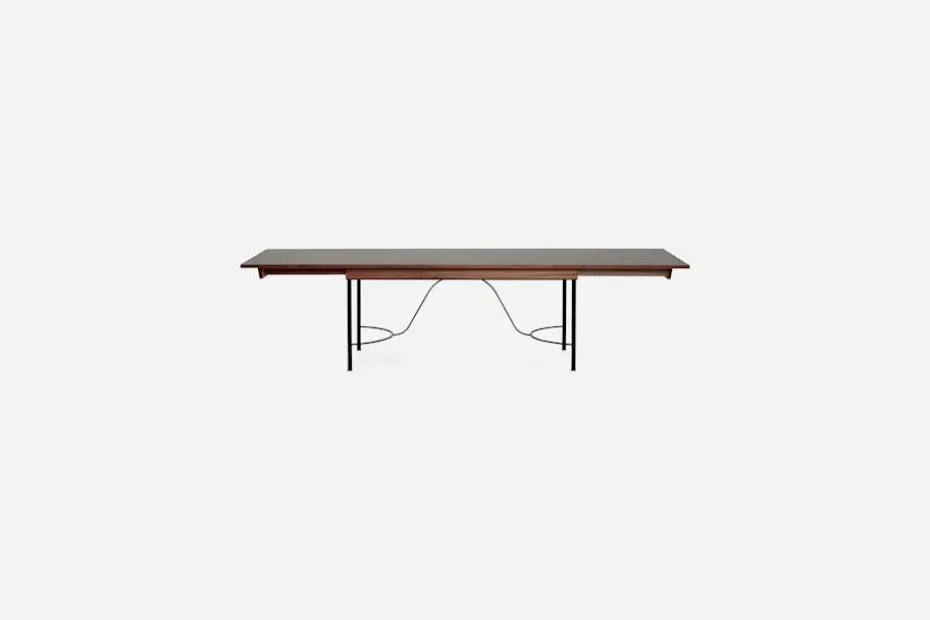 Josef Frank formgav Matbord 884 år 1938. Att blanda olika material var typiskt för Josef Franks formgivning. Här möter skivan i lackat linoleum och valnöt ett stativ av järn med avslutning av mässingsfötter.