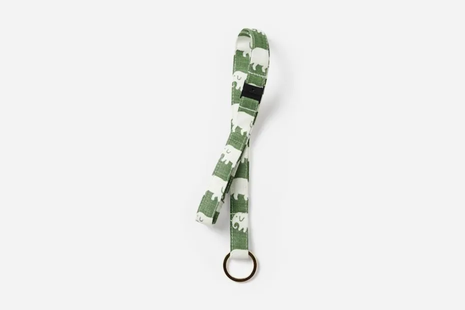 Dekorativt nyckelband i textil med mässingsdetaljer och Estrid Ericsons klassiska Elefantmönster. Svenskt Tenns grundare reste mycket till olika platser runt om i världen. Hon letade alltid efter vackra föremål, textilier och souvenirer att ta hem och sälja i butiken på Strandvägen. Det var efter en förlaga från Belgiska Kongo som hon formgav mönstret med de små elefanterna. Svenskt Tenn tryckte textil Elefant för första gången i slutet av 1930-talet. Nyckelbandet tillverkas av textilrester från Svenskt Tenns övriga produktion.