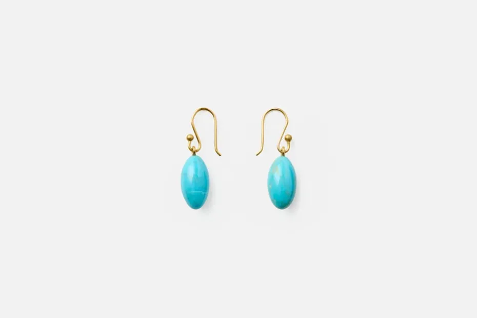 Dessa droppformade örhängen i guld med turkos stenpärla är formgivna av Ted Muehling. Sedan 1976 har han skapat unika smycken med naturen som inspiration, och varje par tillverkas omsorgsfullt för hand i hans studio i New York.
