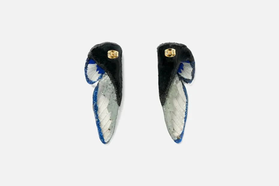 Unika örhängen i form av vingar, skapade av smyckekonstnären Märta Mattsson. I sitt skapande ser Märta det vackra i sådant som kan uppfattas som avstötande. Hon omvandlar döda djur och insekter till smycken och ger dem på så vis ett nytt liv och ett nytt syfte.