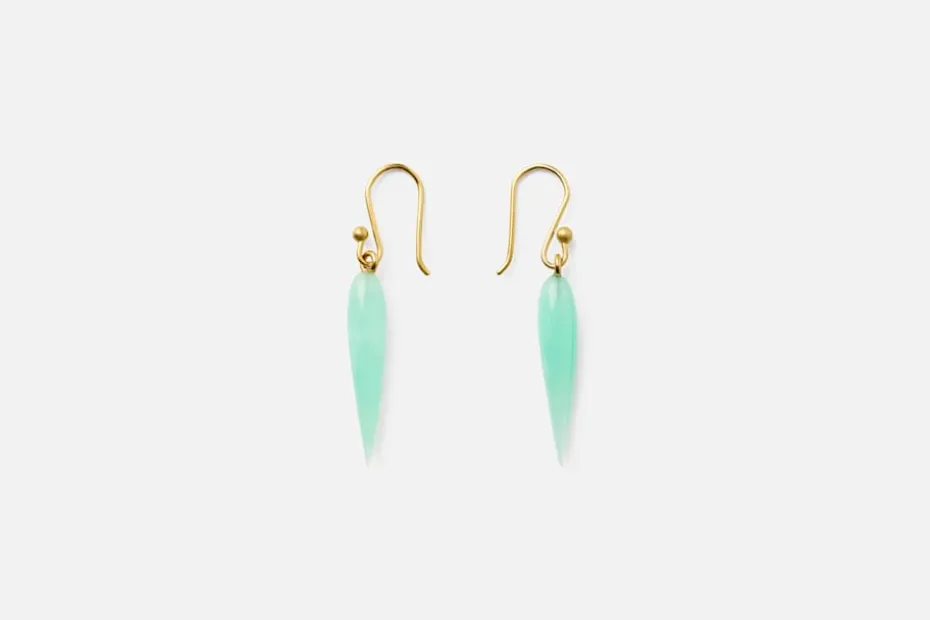 I dessa örhängen i guld formar den turkosa ädelstenen Krysopras en avlång, riskornsformad dekoration. Örhängena är skapade av Ted Muehling, som sedan 1976 har formgivit unika smycken med naturen som inspiration. Varje par tillverkas omsorgsfullt för hand i hans studio i New York.