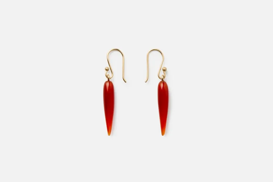I dessa örhängen i guld formar den djupröda ädelstenen Karnerol en avlång, riskornsformad dekoration. Örhängena är skapade av Ted Muehling, som sedan 1976 har formgivit unika smycken med naturen som inspiration. Varje par tillverkas omsorgsfullt för hand i hans studio i New York.
