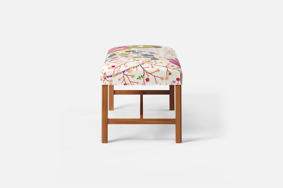 Denna rektangulära, stramt utformade pall med sits i tyg eller skinn formgavs av Josef Frank år 1950. De fyrkantiga benen har den typiska hörnprofileringen som kännetecknar Josef Franks formgivning. Benställningens H-kryss för tankarna till 1700-talets möbelformgivning.