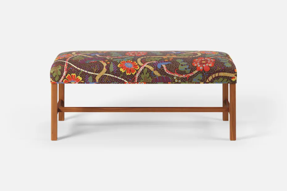 Denna rektangulära, stramt utformade pall med sits i tyg eller skinn formgavs av Josef Frank år 1950. De fyrkantiga benen har den typiska hörnprofileringen som kännetecknar Josef Franks formgivning. Benställningens H-kryss för tankarna till 1700-talets möbelformgivning.
