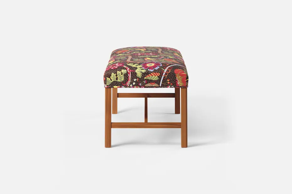 Denna rektangulära, stramt utformade pall med sits i tyg eller skinn formgavs av Josef Frank år 1950. De fyrkantiga benen har den typiska hörnprofileringen som kännetecknar Josef Franks formgivning. Benställningens H-kryss för tankarna till 1700-talets möbelformgivning.